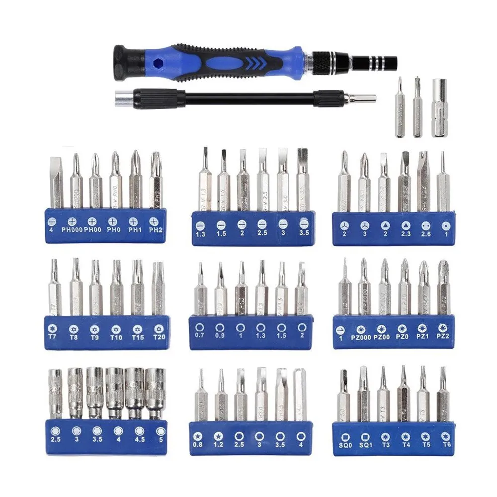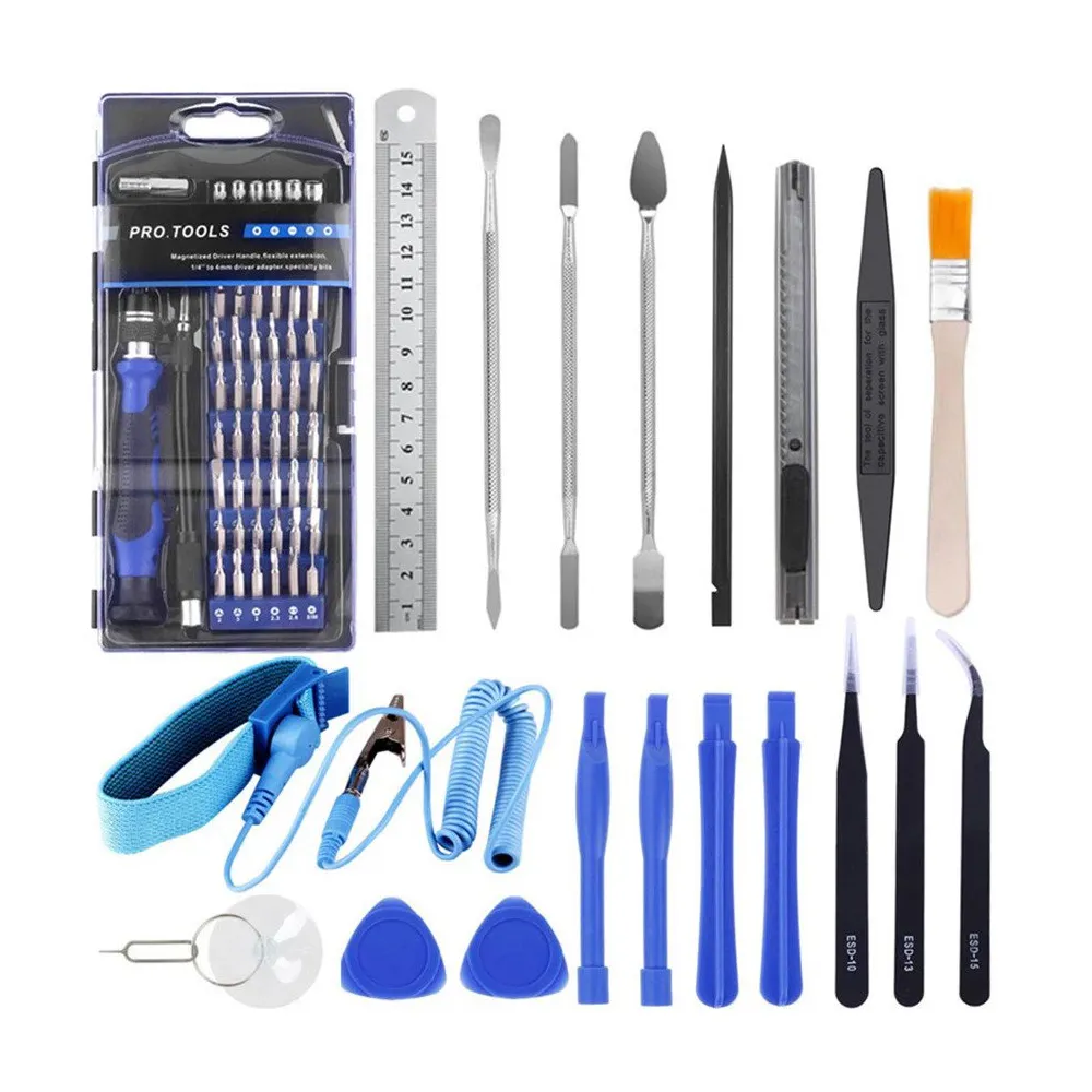 Contains: 60 in 1 disassemble screwdriver + 3 *metal disassemble bar +1* brush + anti-static disassemble bar *1 + ABS disassemble bar *4 + 2* triangles + suction cup card pin *1 + anti-static tweezers *3+ anti-static wrist strap *1 set +15CM steel ruler *1 + utility knife *1 +1 *adjustment screen stick