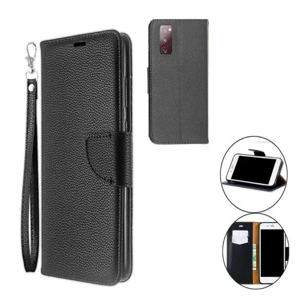 Premium PU leather wallet case , lichi grain finish, with 2 card slots, note pocket. Custom made for Samsung Galaxy s20 FE, with precise cutouts for camera, flash, speaker, fingerprint scanner and easy access to all buttons, controls & ports without having to remove the Samsung Galaxy s20 FE case Features: Made with premium PU leather , lichi grain finish, 2 card slots and 1 cash compartment..The Samsung Galaxy s20 FE case opens like a book with built in kickstand for hands-free video watching and shuts securely with magnetic closure.